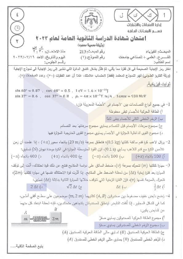 حلول امتحان فيزياء قطاع الصناعة والعلوم التوجيهي الأردن 2023: