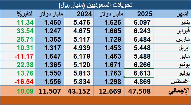 شهريًا ، انخفضت قيمة التحويلات السعودية خلال شهر أغسطس بنسبة 26.37 ٪ من عمليات النقل في يوليو 2025 مترًا ، والتي بلغت 6.61 مليار ريال (1.76 مليار دولار).