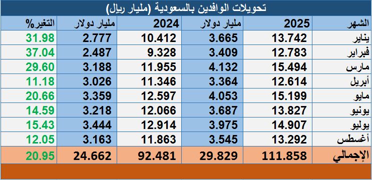 ترتفع عمليات نقل المغتربين في المملكة العربية السعودية إلى 29.8 مليار دولار في الأشهر الثمانية الأولى من عام 2025 ، اليوم ، الثلاثاء ، 30 سبتمبر ، 2025 09:24