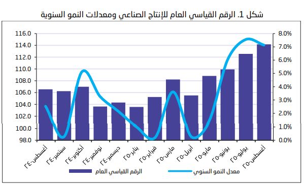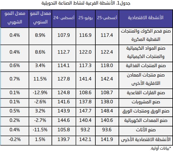 وبالنظر إلى مؤشر الإنتاج الصناعي حسب الأنشطة الاقتصادية، فقد ارتفع مؤشر الأنشطة النفطية بنسبة 8.3% على أساس سنوي في أغسطس 2025، كما ارتفع مؤشر الأنشطة غير النفطية بنسبة 4.4%.