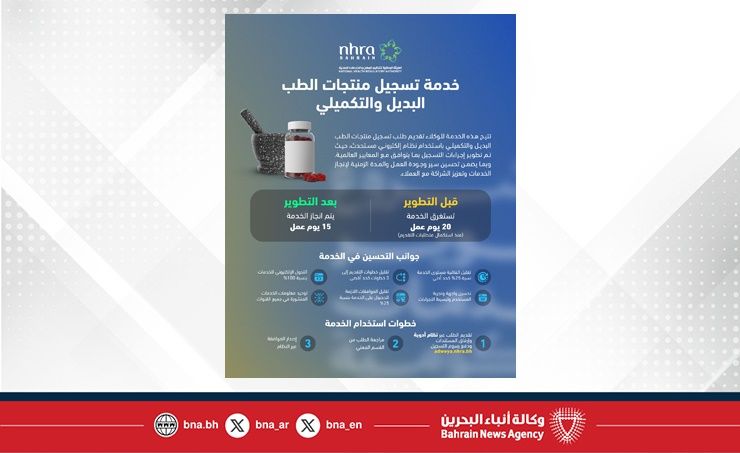 المنامة في 26 يناير/ بنا / في إطار جهود الحكومة لتحسين وإعادة هيكلة جودة الخدمة، قامت الهيئة الوطنية لتنظيم المهن والخدمات الصحية بتطوير خدمة تسجيل منتجات الطب البديل والتكميلي لتبسيط الإجراءات وتحديث الآليات؛ الأمر الذي سينعكس إيجاباً على تحسين تجربة المستفيدين من الجهات الموردة للمنتجات.