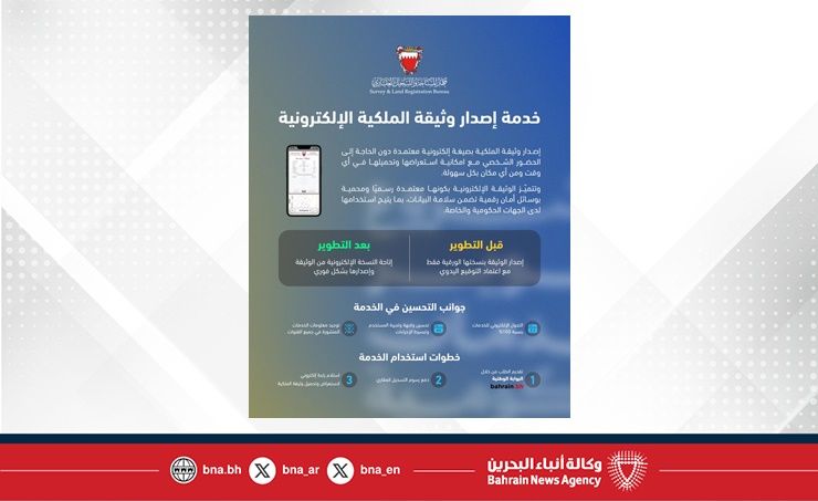 المنامة في 9 فبراير/ بنا / في إطار جهود الحكومة المستمرة لتحسين وإعادة هيكلة جودة الخدمات، أطلقت وكالة المساحة والسجل العقاري خدمة إصدار وثيقة الملكية الإلكترونية كخدمة رقمية جديدة تهدف إلى تسهيل الحصول على الوثيقة وتحسين تجربة المستفيدين ودعم مسار التحول الرقمي الشامل.