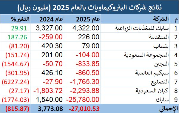 تكبدت الشركة السعودية للصناعات الأساسية (سابك) صافي خسارة 25.78 مليار ريال في 2025، مقارنة بصافي ربح 1.54 مليار ريال في 2024، مما ضغط على نتائج شركات البتروكيماويات.