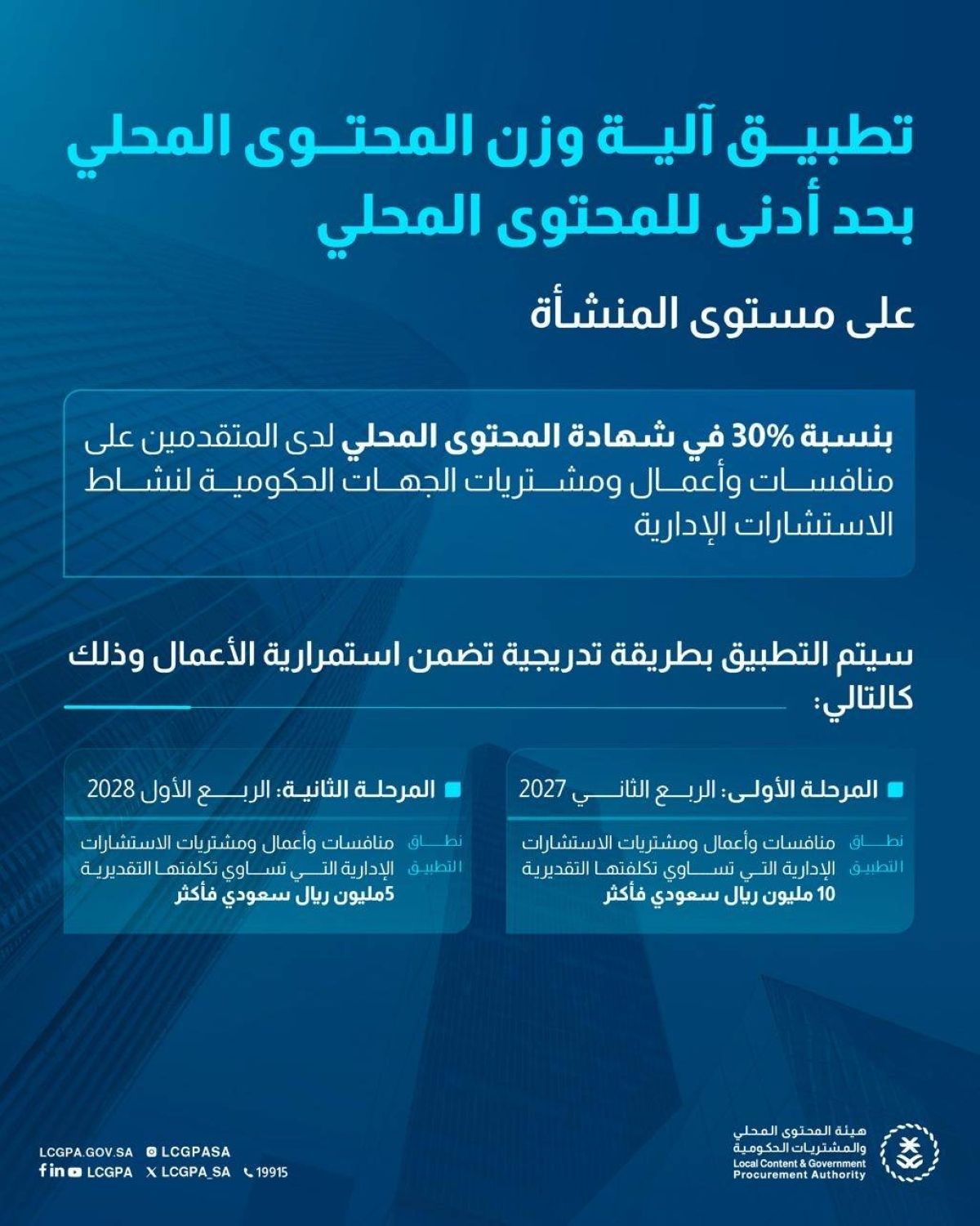 وذكرت المؤسسة أنه سيكون هناك حاجة إلى ما لا يقل عن 30 بالمائة من المحتوى المحلي على مستوى المنشأة في مسابقات الاستشارات الإدارية على مرحلتين. اعتباراً من 1 أبريل 2027 للمسابقات التي تبلغ تكلفتها التقديرية (10 ملايين ريال سعودي) فأكثر، ثم من 1 يناير 2028 للمسابقات التي تبلغ تكلفتها التقديرية (5 ملايين ريال سعودي) وأكثر.