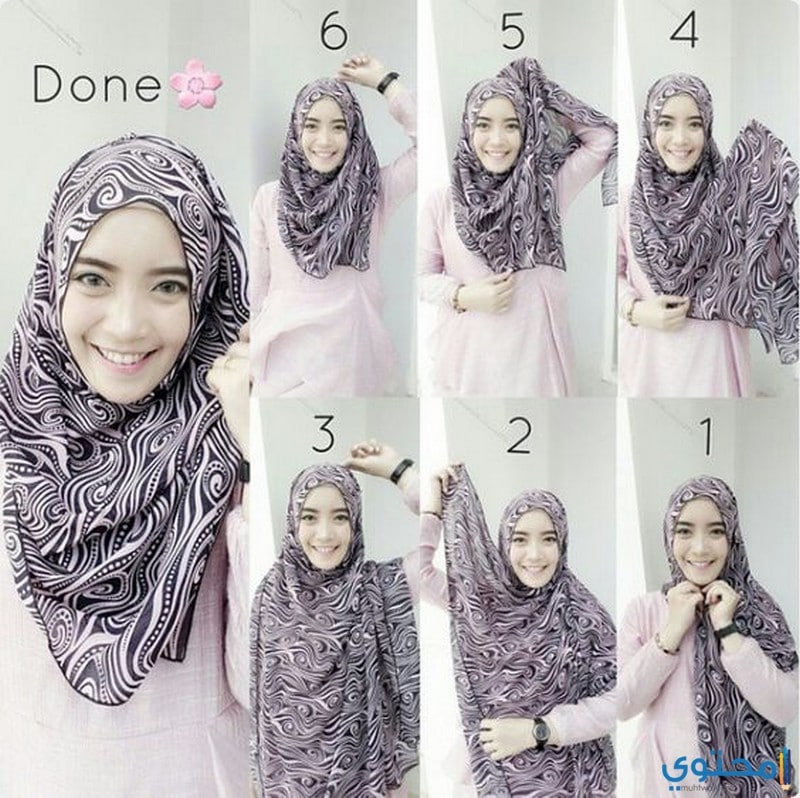 ينقسم الحجاب المربع لـ مثلث ويلف حول العنق والجزء الثاني ، ويأخذ جزء منه ، ويثبته على الكتف الآخر بإمساك قطرة على الوجه.